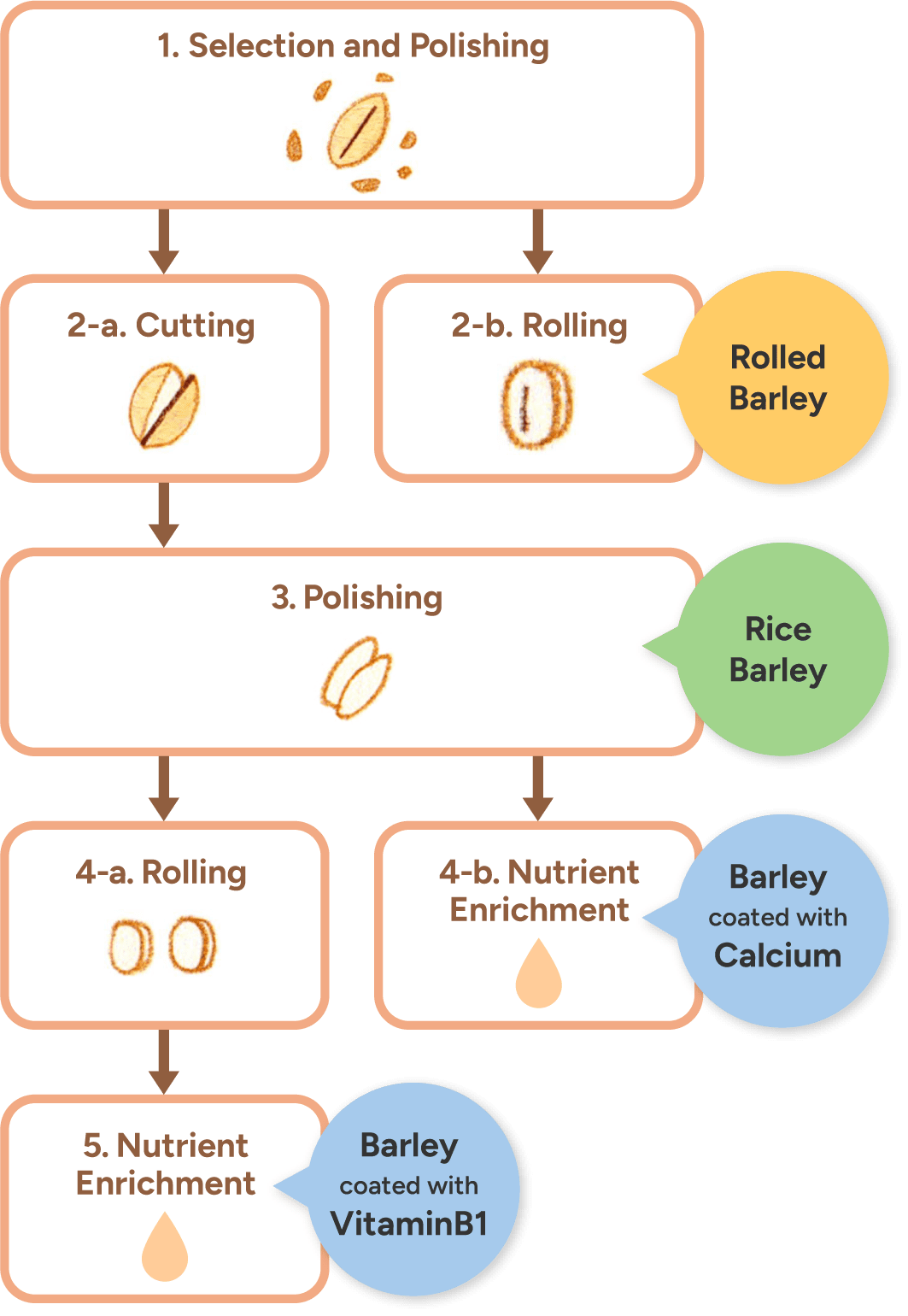 - Polish the surface further using a grindstone. After this, the Rice Barley undergo steaming, cooling, and drying. They are then polished to the same size as rice grains.